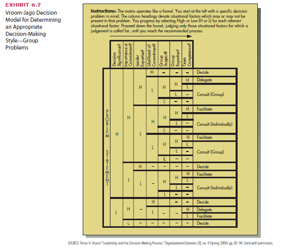 The Vroom-Jago model in Exhibit 6.7 shows that Robbins used the correct decision style. Moving from left to right in Exhibit 6.7, the questions and answers are as fol- lows: How significant is the decision? Definitely high. The company’s future might be at stake. How important is subordinate commitment to the decision? Also high. The team members must support and implement Robbins’ solution. What is the level of Robbins’s information and expertise? Probably low. Even though he has spent several weeks re-searching the seized engines, other team members have additional information and ex- pertise that needs to be considered. If Robbins makes the decision on his own, would team members have high or low commitment to it? The answer to this question is probably also low. Even though team members respect Robbins, they take pride in their work as a team and know Robbins does not have complete information. This leads to the ques- tion, What is the degree of subordinate support for the team’s or organization’s objectives at stake in this decision? Definitely high. This leads to the question, What is the level of group members’ knowledge and expertise in relation to the problem? The answer to this question is low, which leads to the Consult Group decision style, as described earlier in Exhibit 6.6. Thus, Robbins used the style that would be recommended by the Vroom-Jago model.
