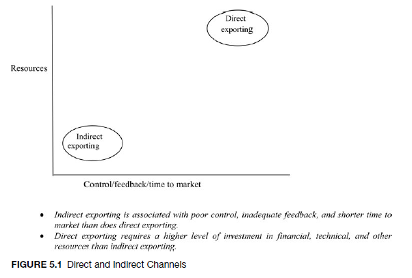 With indirect channels, the firm exports through an independent local middleman that assumes responsibility for moving the product overseas. Indirect exporting entails reliance on another firm to act as a sales intermediary and to assume responsibility for marketing and shipping the product overseas. The manufacturer incurs no start-up cost, and this method provides small firms with little experience in foreign trade access to overseas markets without their direct involvement. However, using indirect channels has certain disadvantages: (1) the manufacturer loses control over the marketing of its product overseas, and (2) the manufacturer’s success totally depends on the initiative and efforts of the chosen intermediary. The latter could provide low priority to or even discontinue marketing the firm’s products in cases in which a competitor’s product provides a better sales or profit potential (Figure 5.1).