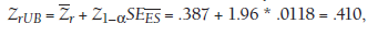 = .363, which would then be transformed (using Equation 5.3) for reporting to a lower-bound r = .348. Similarly, I would compute the upper-bound value