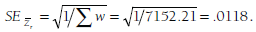 To illustrate these computations using the running example, I refer again to Table 8.1. I have already summed the weights (w) across the 22 studies, so I can apply Equation 8.3 to obtain the standard error of the mean effect size,