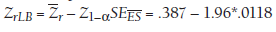 I can use this standard error to evaluate the statistical significance of the average effect size (Zr) using the Wald test of Equation 8.4, Z = .387/0118 = 32.70, p < .001. I would therefore conclude that this average effect size is significantly greater than zero (i.e., there is a positive association between relational aggression and peer rejection). To create 95% confidence intervals, I would compute the lower-bound value of the effect size using Equation 8.5 as