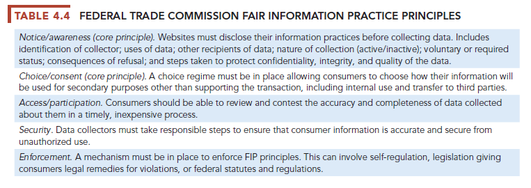 Most American and European privacy law is based on a regime called Fair Information Practices (FIP), first set forth in a report written in 1973 by a federal government advisory committee and updated in 2010 to take into account new privacy-invading technology (U.S. Department of Health, Education, and Welfare, 1973). FIP is a set of principles governing the collection and use of information about individuals. FIP principles are based on the notion of a mutuality of interest between the record holder and the individual. The individual has an interest in engaging in a transaction, and the record keeper—usually a business or government agency—requires information about the individual to support the transaction. After information is gathered, the individual maintains an interest in the record, and the record may not be used to support other activities without the individual’s consent. In 1998, the Federal Trade Commission (FTC) restated and extended the original FIP to provide guidelines for protecting online privacy. Table 4.4 describes the FTC’s FIP principles.