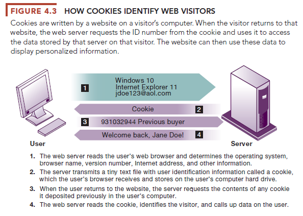 Cookies are small text files deposited on a computer hard drive when a user visits websites. Cookies identify the visitor’s web browser software and track visits to the website. When the visitor returns to a site that has stored a cookie, the website software searches the visitor’s computer, finds the cookie, and knows what that person has done in the past. It may also update the cookie, depending on the activity during the visit. In this way, the site can customize its content for each visitor’s interests. For example, if you purchase a book on Amazon.com and return later from the same browser, the site will welcome you by name and recommend other books of interest based on your past purchases. DoubleClick, described earlier in this chapter, uses cookies to build its dossiers with details of online purchases and examine the behavior of website visitors. Figure 4.3 illustrates how cookies work.