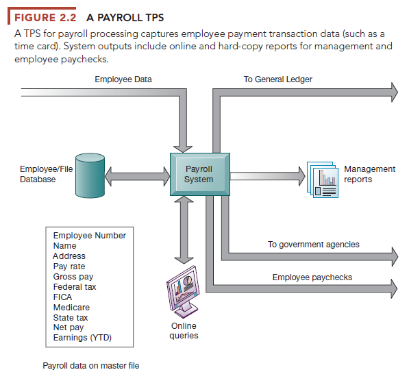 Figure 2.2 illustrates a TPS for payroll processing. A payroll system keeps track of money paid to employees. An employee time sheet with the employee’s name, social security number, and number of hours worked per week represents a single transaction for this system. Once this transaction is input into the system, it updates the system’s master file (or database) that permanently maintains employee information for the organization. The data in the system are combined in different ways to create reports of interest to management and government agencies and to send paychecks to employees.