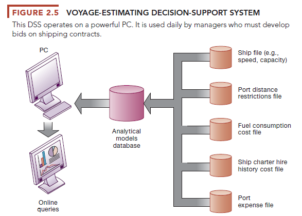 An interesting, small, but powerful DSS is the voyage-estimating system of a large global shipping company that transports bulk cargoes of coal, oil, ores, and finished products. The firm owns some vessels, charters others, and bids for shipping contracts in the open market to carry general cargo. A voyage-estimating system calculates financial and technical voyage details. Financial calculations include ship/time costs (fuel, labor, capital), freight rates for various types of cargo, and port expenses. Technical details include myriad factors, such as ship cargo capacity, speed, port distances, fuel and water consumption, and loading patterns (location of cargo for different ports).