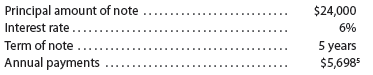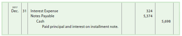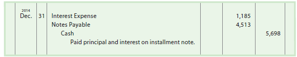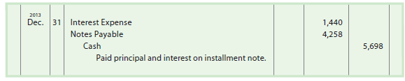 The preceding note payable requires Lewis Company to repay the principal and interest in equal payments of $5,698 beginning December 31, 2013, for each of the next five years. Unlike bonds, however, each installment note payment includes an interest and principal component.