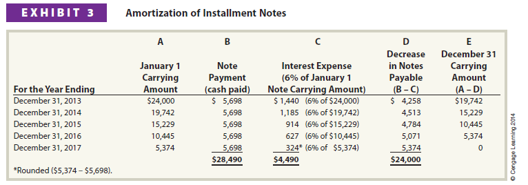 - The interest expense (Column C) is computed at 6% of the installment note carrying amount at the beginning of each year. As a result, the interest expense decreases each year.