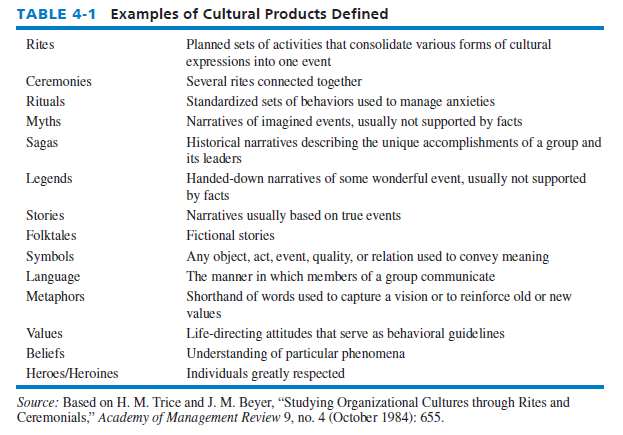 Defined in Table 4-1, cultural products include values, beliefs, rites, rituals, ceremonies, myths, stories, legends, sagas, language, metaphors, symbols, folktales, and heroes and heroines. These products or dimensions are levers that strategists can use to influence and direct strategy formulation, implementation, and evaluation activities. An organization’s culture compares to an individual’s personality in the sense that no two organizations have the same culture and no two individuals have the same personality. Both culture and personality are enduring and can be warm, aggressive, friendly, open, innovative, conservative, liberal, harsh, or likable.