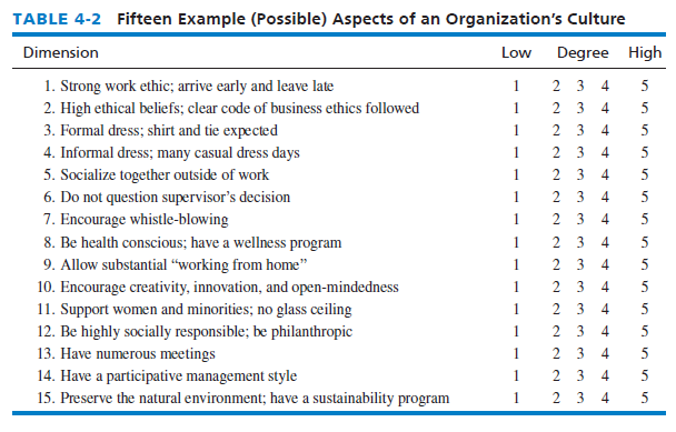 Table 4-2 provides some example (possible) aspects of an organization’s culture. Note that you might want to ask employees and managers to rate the degree that the dimension characterizes the firm. When one firm acquires another firm, integrating the two cultures effectively can be vital for success. For example, in Table 4-2, one firm may score mostly 1s (low) and the other firm may score mostly 5s (high), which would present a challenging strategic problem.