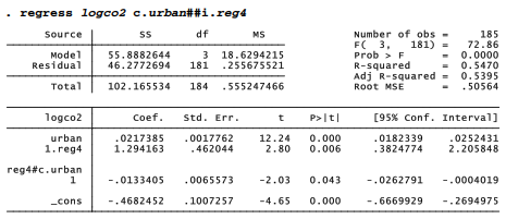 . regress logco2 c.urban i.reg4 c.urban#i.reg4