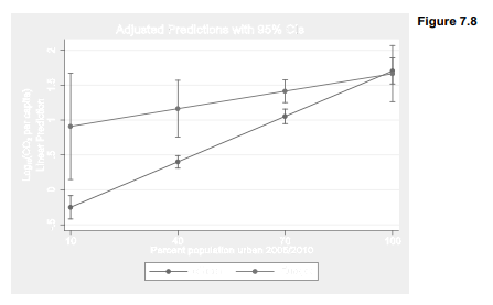 margins understands # or ## interactions. Percent urban ranges from about 10 to 100 percent in these data, so we could graph the interaction as follows. First calculate the predicted means of logco2 at several combinations of urban (10, 40, 70 or 100) and reg4 (0 or 1).