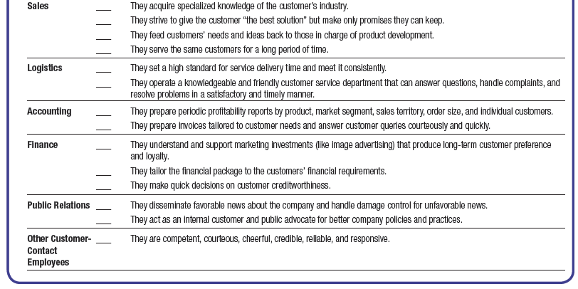 Internal marketing requires that everyone in the organization accept the concepts and goals of marketing and engage in identifying, providing, and communicating customer value. Only when all employees realize their job is to create, serve, and satisfy customers does the company become an effective marketer.7 “Marketing Memo: Characteristics of Company Departments That Are Truly Customer Driven” presents a tool that evaluates which company departments excel at being customer-centric.