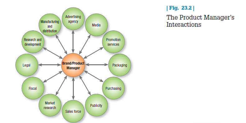 A product-management organization makes sense if the company’s products are quite different or there are more than a functional organization can handle. This form is sometimes characterized as a hub-and-spoke system. The brand or product manager is figuratively at the center, with spokes leading to various departments representing working relationships (see Figure 23.2). The manager may: