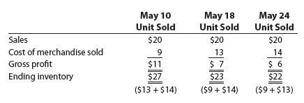 Assume that one unit is sold on May 30 for $20. Depending upon which unit was sold, the gross profit varies from $11 to $6 as shown below.