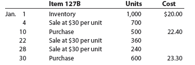 - On January 4, 700 units were sold at a price of $30 each for sales of $21,000 (700 units x $30). The cost of merchandise sold is $14,000 (700 units at a unit cost of $20.00). After the sale, there remains $6,000 of inventory (300 units at a unit cost of $20.00).