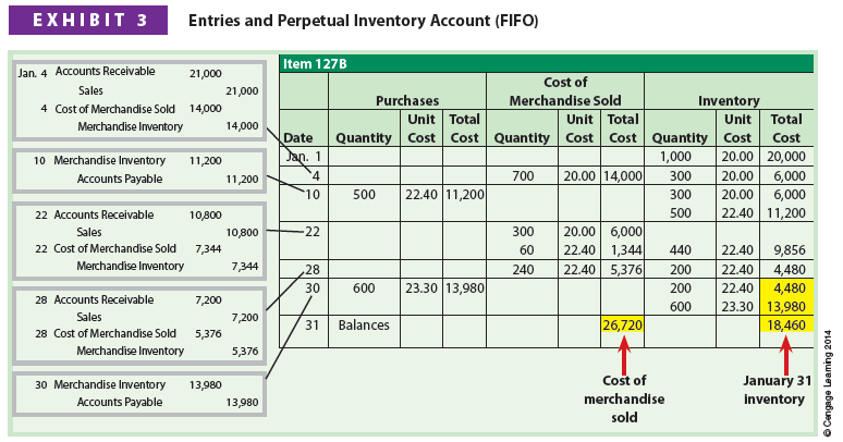 To illustrate, Exhibit 3 shows the use of FIFO under a perpetual inventory system for Item 127B. The journal entries and the subsidiary inventory ledger for Item 127B are shown in Exhibit 3 as follows: