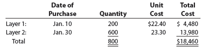 - On January 10, $11,200 is purchased (500 units at a unit cost of $22.40). After the purchase, the inventory is reported on two lines, $6,000 (300 units at a unit cost of $20.00) from the beginning inventory and $11,200 (500 units at a unit cost of $22.40) from the January 10 purchase.