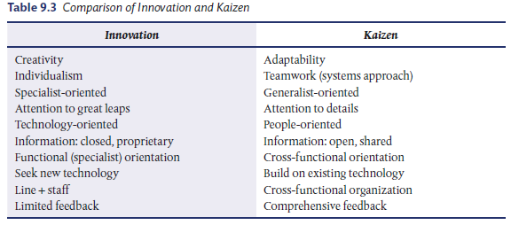 Innovation is seen as a major change in the wake of technological breakthroughs. Innovation is dramatic and a real attention-getter. Kaizen, on the other hand, is often undramatic and subtle, and its results are seldom immediately visible. While Kaizen is a continuous process that implies continuous improvement and involves every employee in every company function at all levels of the organization, innovation is generally a one-shot phenomenon. The comparison between Kaizen and innovation is shown in Tables 9.2 and 9.3.