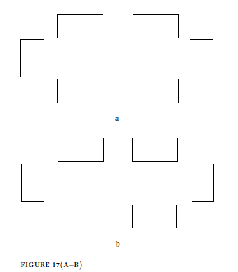 Seeing the outline of partially occluded yet complete rectangles in the upper and lower clips in figure 17(a) makes a rectangular surface, which is also brighter than the background, to appear above them. Although there is no physical property in the stimulation corresponding to the borders of the rectangular surface, nor any difference of reflectance between the regions that appear as either the overlying surface or the ground, this figure still appears with such a visible shape that it induces the stratification of the field. The modification in figure 17(b), namely closing the boundary of the clips, makes the conditions of perceptual completion vanish, and no mental representation can help in perceiving these ones as something other than segregated rectangles and disconnected pieces.