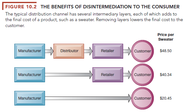 Figure 10.2 illustrates how much savings result from eliminating each of these layers in the distribution process. By selling directly to consumers or reducing the number of intermediaries, companies can raise profits while charging lower prices. The removal of organizations or business process layers responsible for intermediary steps in a value chain is called disintermediation. E-commerce has also given rise to a completely new set of new intermediaries such as Amazon, eBay, PayPal, and Blue Nile. Therefore, disintermediation differs from one industry to another.