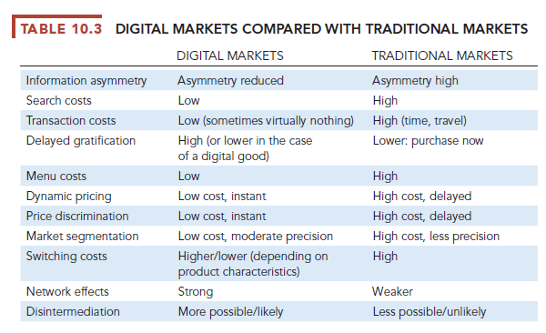 Disintermediation is affecting the market for services. Airlines and hotels operating their own reservation sites online earn more per ticket because they have eliminated travel agents as intermediaries. Table 10.3 summarizes the differences between digital markets and traditional markets.