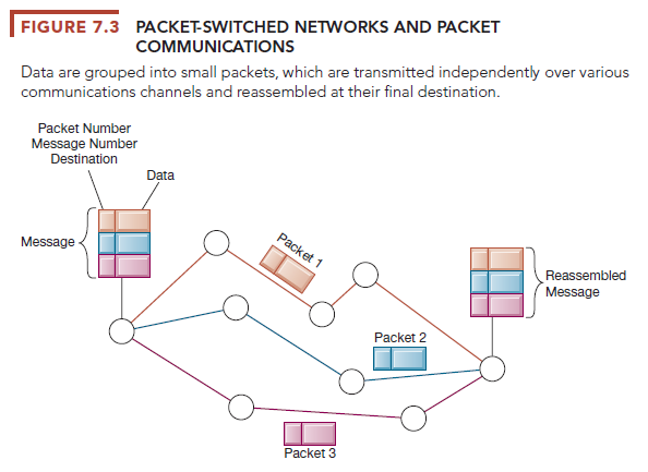 Packet switching is a method of slicing digital messages into parcels called packets, sending the packets along different communication paths as they become available, and then reassembling the packets once they arrive at their destinations (see Figure 7.3). Prior to the development of packet switching, computer networks used leased, dedicated telephone circuits to communicate with other computers in remote locations. In circuit-switched networks, such as the telephone system, a complete point-to-point circuit is assembled, and then communication can proceed. These dedicated circuit-switching techniques were expensive and wasted available communications capacity—the circuit was maintained regardless of whether any data were being sent.