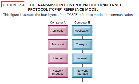 TCP/IP uses a suite of protocols, the main ones being TCP and IP. TCP refers to the Transmission Control Protocol, which handles the movement of data between computers. TCP establishes a connection between the computers, sequences the transfer of packets, and acknowledges the packets sent. IP refers to the Internet Protocol (IP), which is responsible for the delivery of packets and includes the disassembling and reassembling of packets during transmission. Figure 7.4 illustrates the four-layered Department of Defense reference model for TCP/IP, and the layers are described as follows: