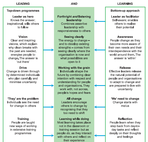 We are all now familiar with the mantra that change is a constant in our world and that its pace is increasing. Inevitably therefore leaders will find themselves leading, promoting, encouraging and stimulating change as a key part of their role. In this last part of the chapter we will briefly review the nature of organisational change, explain a traditional perspective on managing and leading change and contrast this with a learning perspective suggested by Binney and Williams (2005). We will then link these two perspectives back to perspectives on the nature of leadership.