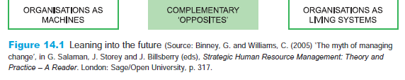 They propose that this perspective suggests change is natural, if painful, and that the challenge is to release the potential for change rather than drive it. In addition they identify the need for some stability as well as change. They suggest that this perspective encourages the view that managers cannot control change, and that the problem with a vision for the future is that it denigrates the present and the past of the organisation. A good example of this is the town of Crewe. Much effort and money is being put in to regenerate and develop the town, but whilst there are newcomers who feel this is an excellent change programme, there are many people who have been brought up in the town who feel that the changes are unnecessary and are spoiling things. The living organism approach also suggests that trying to copy excellence elsewhere is a fruitless task, as is a change consultant or chief executive telling people to change; changes, they suggest, emerge and the key is seeing the new pattern, drawing attention to it and reinforcing it. The acceptance that the future is unknowable and unpredictable is important, as is the need for leaders to recognise that they are also part of the problem, and acknowledge that people are not rational and that feelings and emotion are legitimate. They characterise this approach to change as a learning approach rather than a leading approach, but recognise that both perspectives add value in a change situation; in order to reflect this they propose the concept of ‘leaning into the future’. Figure 14.1 summarises their thinking.
