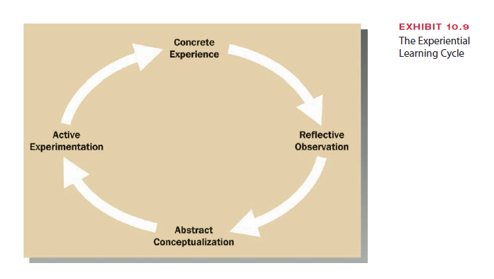 One model of the learning process, shown in Exhibit 10.9, depicts learning as a four-stage cycle.52 First, a person encounters a concrete experience. This event is followed by thinking and reflective observation, which leads to abstract conceptualization and, in turn, to active experimentation. The results of the experimentation generate new experiences, and the cycle repeats.