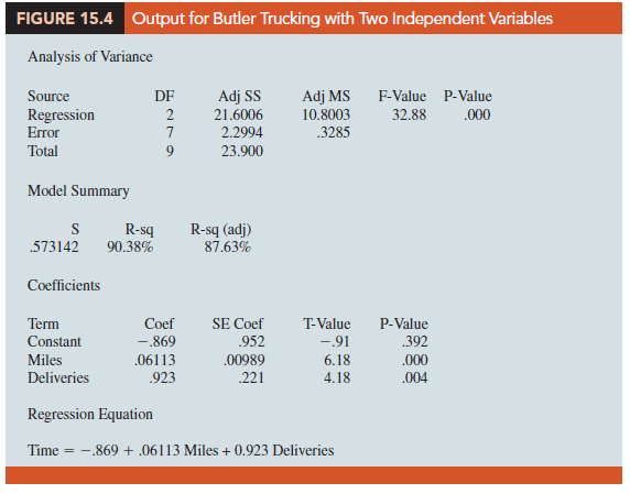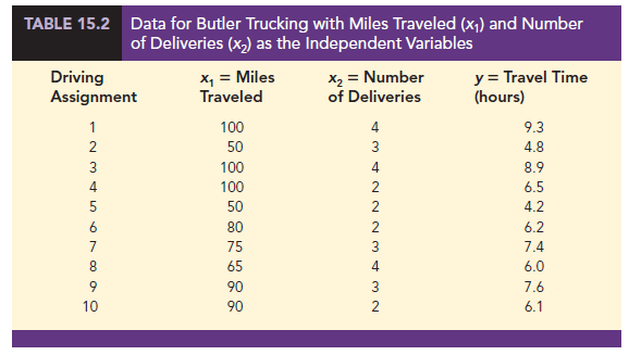 In attempting to identify another independent variable, the managers felt that the number of deliveries could also contribute to the total travel time. The Butler Trucking data, with the number of deliveries added, are shown in Table 15.2. Computer output with both miles traveled (x^ and number of deliveries (x2) as independent variables is shown in Figure 15.4. The estimated regression equation is