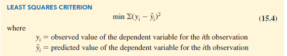 As expression (15.4) shows, the least squares method uses sample data to provide the values of b0, b1, b2, • • • , bp that make the sum of squared residuals (the deviations between the observed values of the dependent variable (y;) and the predicted values of the dependent variable (y) a minimum.