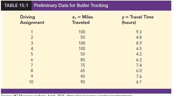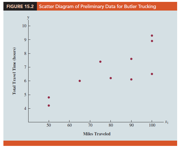 Initially the managers believed that the total daily travel time would be closely related to the number of miles traveled in making the daily deliveries^ A simple random sample of 10 driving assignments provided the data shown in Table 15T and the scatter diagram shown in Figure 15.2. After reviewing this scatter diagram, the managers hypothesized that the simple linear regression model y = β0 + β1x1 + e could be used to describe the relationship between the total travel time (y) and the number of miles traveled CyX To estimate the parameters β0 and β1, the least squares method was used to develop the estimated regression equatiom