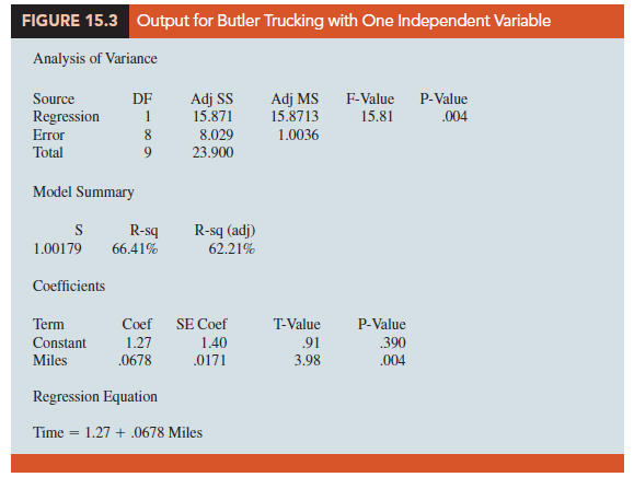 At the 35 level of significance, the F value of 1531 and its corresponding p-value of 304 indicate that the relationship is significant; that is, we can reject H0: β1 = 0 because the p-value is less than a = .05. Note that the same conclusion is obtained from the t value of 3.98 and its associated p-value of .004. Thus, we can conclude that the relationship between the total travel time and the number of miles traveled is significant; longer travel times are associated with more miles traveled. With a coefficient of determination (expressed as a percentage) of R-Sq = 66.41%, we see that 66.41% of the variability in travel time can be explained by the linear effect of the number of miles traveled. This finding is fairly good, but the managers might want to consider adding a second independent variable to explain some of the remaining variability in the dependent variable.