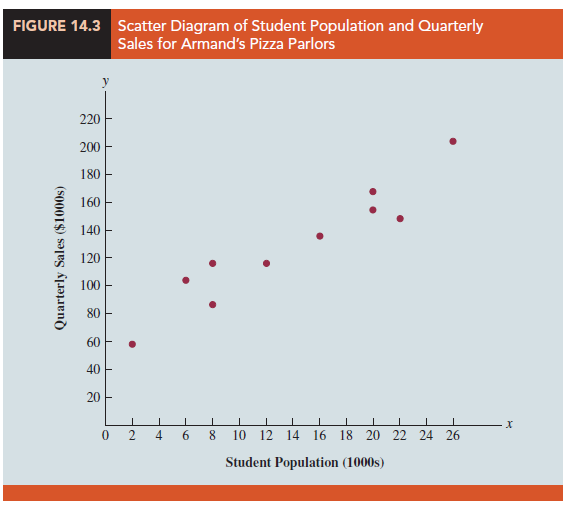 The least squares method is a procedure for using sample data to find the estimated regression equation. To illustrate the least squares method, suppose data were collected from a sample of 10 Armand’s Pizza Parlor restaurants located near college campuses. For the ith observation or restaurant in the sample, xi is the size of the student population (in thousands) and y is the quarterly sales (in thousands of dollars). The values of xi and y for the 10 restaurants in the sample are summarized in Table 14.1. We see that restaurant 1, with x1 = 2 and y1 = 58, is near a campus with 2000 students and has quarterly sales of $58,000. Restaurant 2, with x2 = 6 and y2 = 105, is near a campus with 6000 students and has quarterly sales of $105,000. The largest sales value is for restaurant 10, which is near a campus with 26,000 students and has quarterly sales of $202,000.