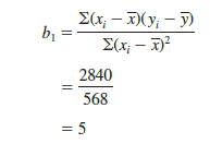 Using equations (14.6) and (14.7) and the information in Table 14.2, we can compute the slope and intercept of the estimated regression equation for Armand’s Pizza Parlors. The calculation of the slope (b1) proceeds as follows.
