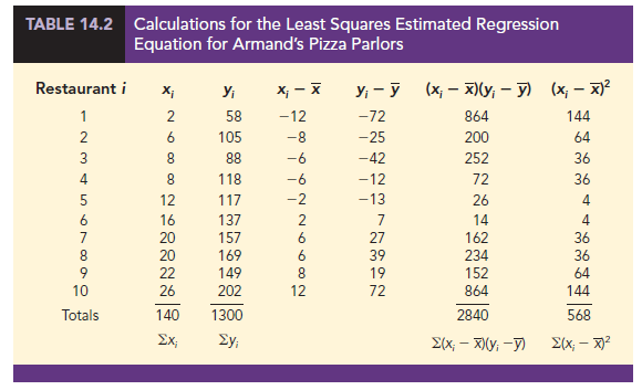 Using equations (14.6) and (14.7) and the information in Table 14.2, we can compute the slope and intercept of the estimated regression equation for Armand’s Pizza Parlors. The calculation of the slope (b1) proceeds as follows.