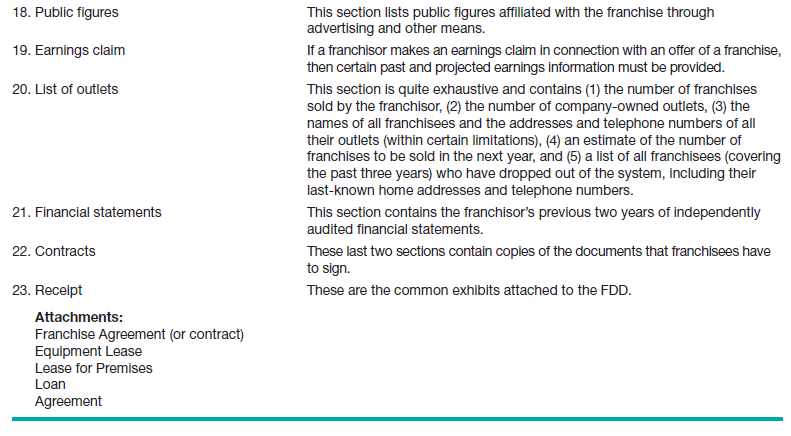 However, the offer and sale of a franchise is regulated at the federal level. Under the Franchise Rule, which is enforced by the Federal Trade Commission (FTC), franchisors must furnish potential franchisees with written disclosures that provide information about the franchisor, the franchised business, and the franchise relationship. The disclosures must be supplied at least 14 busi- ness days before a franchise agreement can be signed or the franchisee pays the franchisor any money.22 In most cases, the disclosures are made through a lengthy document referred to as the Franchise Disclosure Document, which is accepted in all 50 states and parts of Canada. The Franchise Disclosure Document (FDD) contains 23 categories of information that give a prospective franchisee a broad base of information about the background and financial health of the franchisor. A summary of the information contained in the FDD is provided in Table 15.7. A prospective franchisee should fully understand all the information contained in the FDD before a franchise agreement is signed.