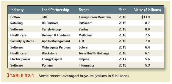 With the onset of the credit crisis, the LBO boom of 2006-2007 withered rapidly. Although buyout firms entered 2008 with large amounts of capital to invest, banks and investment institutions became much more wary of lending to LBOs. By 2009, the value of buyout deals had fallen by 90% from its 2007 high. Since then, the market has slowly recovered, but the targets have generally been tiddlers compared with those of the boom years. Table 32.1 lists some recent transactions.