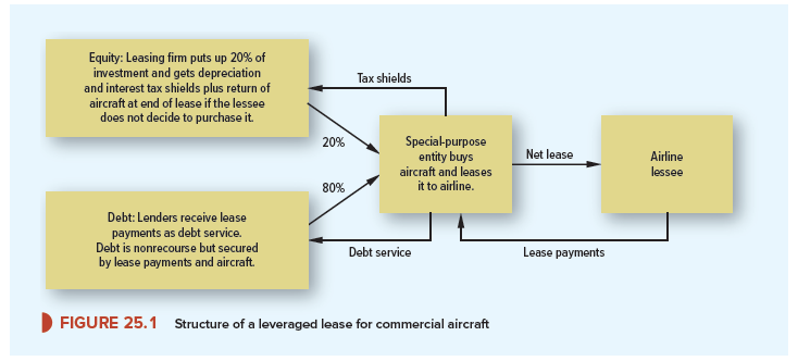 Big-ticket leases are usually leveraged leases. The structure of a leveraged lease is summarized in Figure 25.1. In this example, the leasing company (or a syndicate of several leasing companies) sets up a special-purpose entity (SPE) to buy and lease a commercial aircraft. The SPE raises up to 80% of the cost of the aircraft by borrowing, usually from insurance companies or other financial institutions. The leasing company puts up the remaining 20% as the equity investment in the lease.
