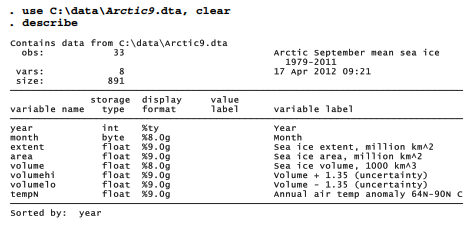 Connected-line and line plots tend to have different uses than scatterplots. For example, they serve well to graph changes in a variable over time. To illustrate, we return to dataset Arctic9.dta, which contains 33 years of Arctic sea ice and temperature observations.