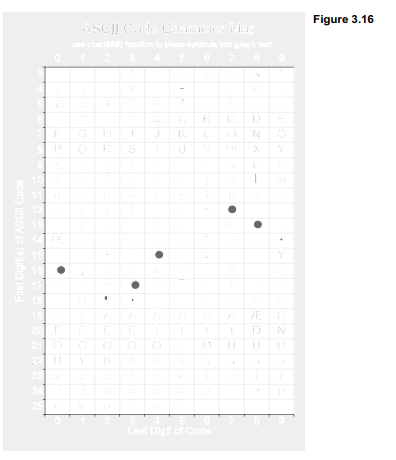 How do we know that character 150 is an n-dash, character 186 a degree symbol, and so forth? Figure 3.16 gives a table of ASCII codes, drawn by a convenient utility named asciiplot. This is not part of Stata but written in Stata’s programming language by geographical statistician Nicholas Cox. Type findit asciiplot for instructions on how to download and install this program, which makes the table in Figure 3.16 available whenever you type asciiplot.