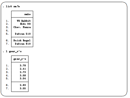 - You can list a variable by using an abbreviation unique to that variable, as in list gear_r~o. If the abbreviation is not unique, Stata returns an error message.