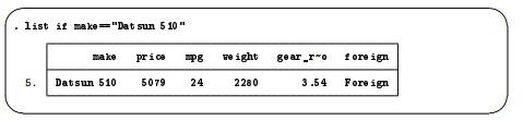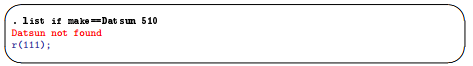 Strings must be in double quotes, as in make==”Datsun 510″. Without the quotes, Stata thinks that Datsun is a variable that it cannot find. Here is the correction:
