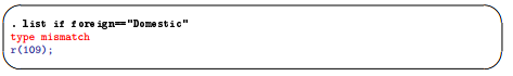 Value labels look like strings, but the underlying variable is numeric. Variable foreign takes on values 0 and 1 but has the value label that attaches 0 to “Domestic” and 1 to “Foreign” (see [GSW] 9 Labeling data). To see the underlying numeric values of variables with labeled values, use the label list command (see [D] label), or investigate the variable with codebook varname. We can correct the error here by looking for observations where foreign==0.