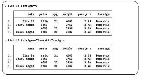 Keeping these rules in mind, let’s investigate how list behaves when called with different arguments. We will be using the dataset afewcarslab.dta from the end of the previous chapter.