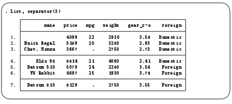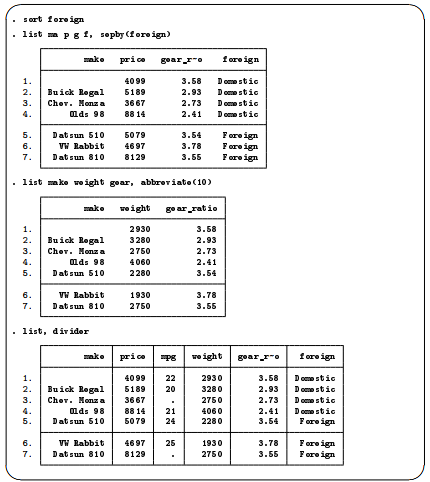 The fine control over list output is exercised by specifying one or more options. You can use sepby() to separate observations by variable. abbreviate() specifies the minimum number of characters to abbreviate a variable name in the output. divider draws a vertical line between the variables in the list.