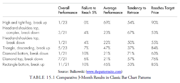 According to Bulkowski (2015), the best-performing patterns, considering gain and risk, are the high-and- tight upward breaking flag, the head-and-shoulders top, top islands breaking down (to be covered in Chapter 17), and upward breaking descending triangles. A summary of these patterns is shown in Table 15.1.