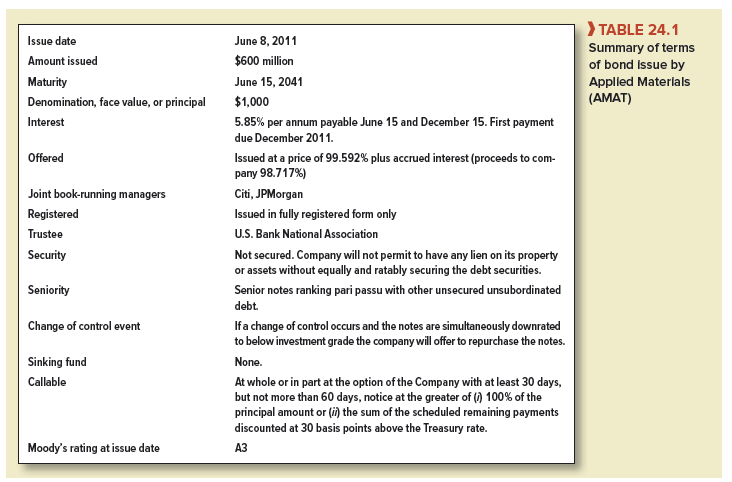 Applied Materials (AMAT) supplies equipment and software for the manufacture of semiconductors. In 2011, AMAT issued 30-year bonds to help finance an acquisition. The bond was a plain-vanilla issue; in other words, it was pretty well standard in every way. To give you some feel for the bond contract (and for some of the language in which it is couched), we have summarized in Table 24.1 the terms of the issue. We will look in turn at its principal features.