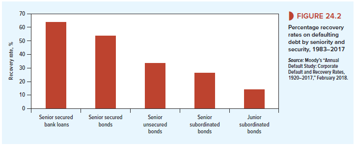 As you can see from Figure 24.2, if default does occur, it pays to hold senior secured bonds. On average, investors in these bonds can expect to recover over 50% of the amount of the loan. At the other extreme, recovery rates for junior unsecured bondholders are only 14% of the face value of the debt.